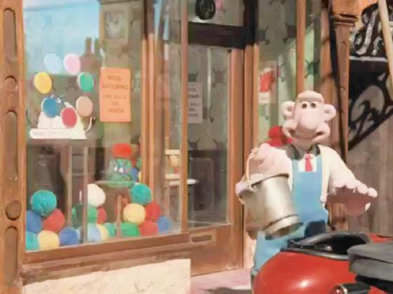 At 05:21, a toy sheep is shown in the window of Wendolene's Wools shop,