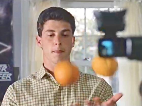 At 0:55:57, Corey Parker juggles 3 oranges in his bedroom very smoothly.