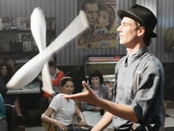 At 23:03, Daan Mackel portrays a juggler who entertains at Saül's