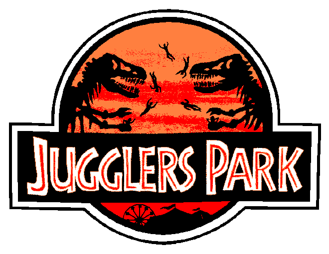 Two T-Rex's passing 7 people in Juggler's Park logo.